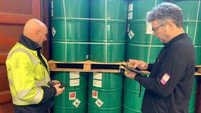 De documenten hebben we al ontvangen. Nadat de container opengaat kijken we naar stuwage, of er opschriften voor gevaarlijke stoffen op de vaten zitten en of de vaten op de juiste manier gekeurd zijn. We kijken dan specifiek naar de keuring van het vat. Dat zie je op die witte sticker in de hoek. De opschriften voor vervoer gevaarlijke stoffen. Dat bekend is wat wat is. En dat is het etiket zelf. En dat is het UN-nummer. Dat is ook de omschrijving. En hier zie je ook dat het een milieugevaarlijke stof betreft.